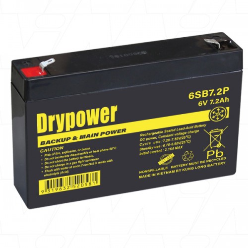 - Product Code: 6SB7.2P Drypower 6V 7.2Ah SLA Multi Use Battery